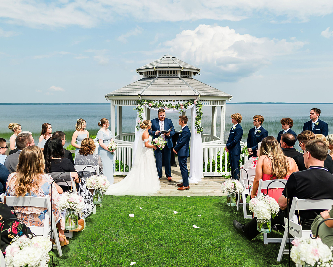 Set against the open horizon of Lake Michigan, the waterfront gazebo offers a naturally romantic setting for ceremonies. The bay, sky, and shoreline frame each exchange of vows, creating a moment that feels intimate, grounded, and quietly breathtaking.